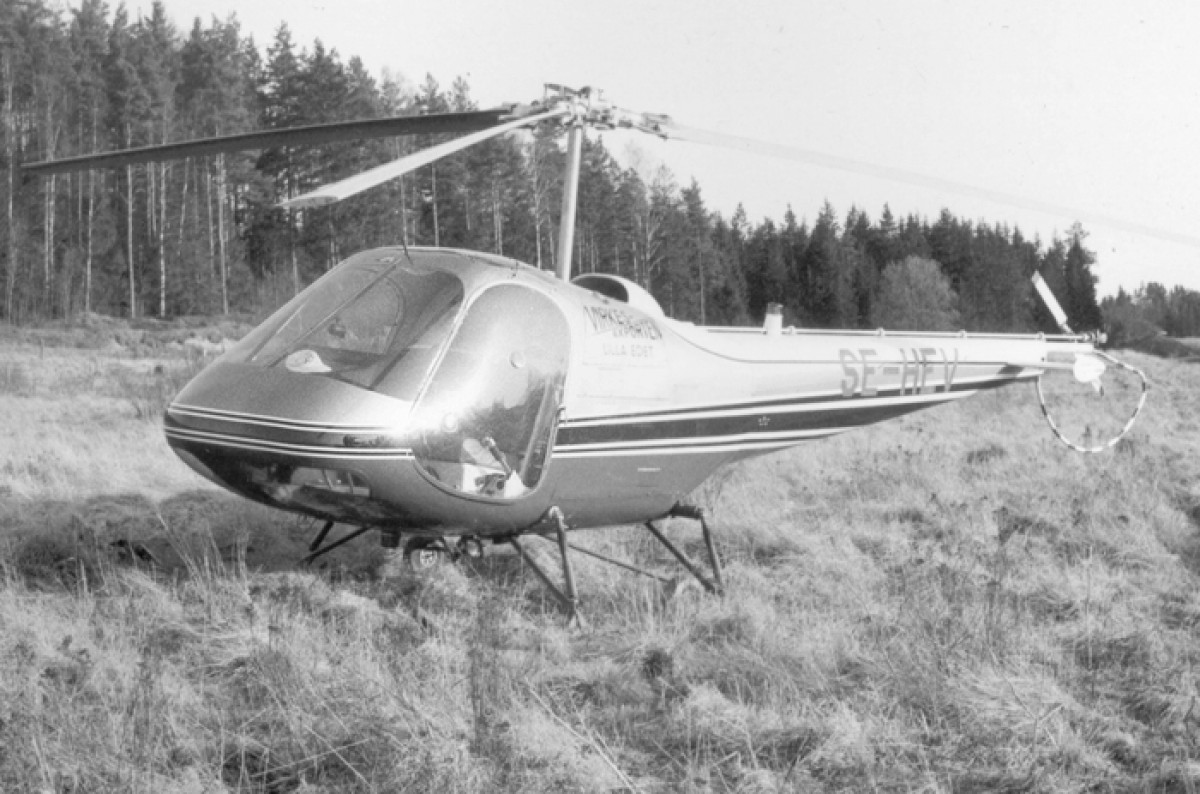 This helicopter was photographed in Färgelanda wearing titles publicizing the company Virkes-Exporten in Lilla Edet, however the owner was Gothenburg-based West-Aero Helicopter AB.