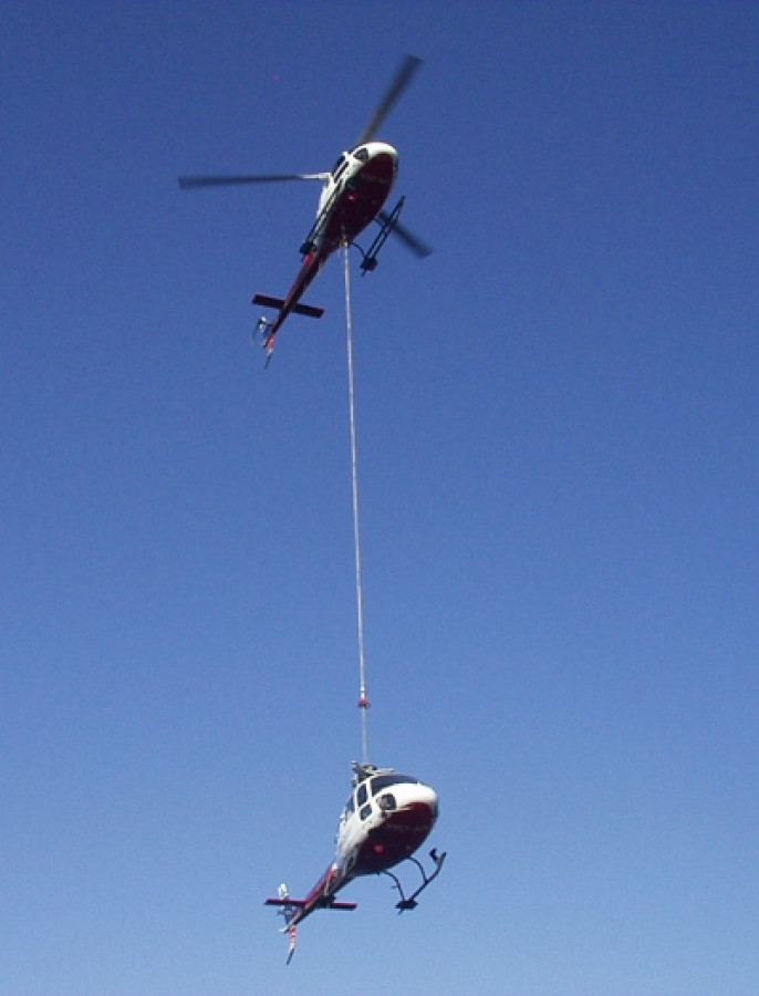 The Ecureuil LN-OAK is being airlifted by one of its Ecureuil colleagues after an accident.