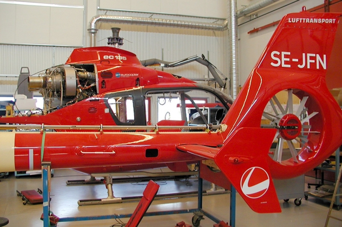 Weeks after delivery to Sweden, in early February 2002. This photo shows the helicopter as it is going through EMS modifications at Patria Ostermans Aero\\\'s maintenance facility at Arlanda Airport.