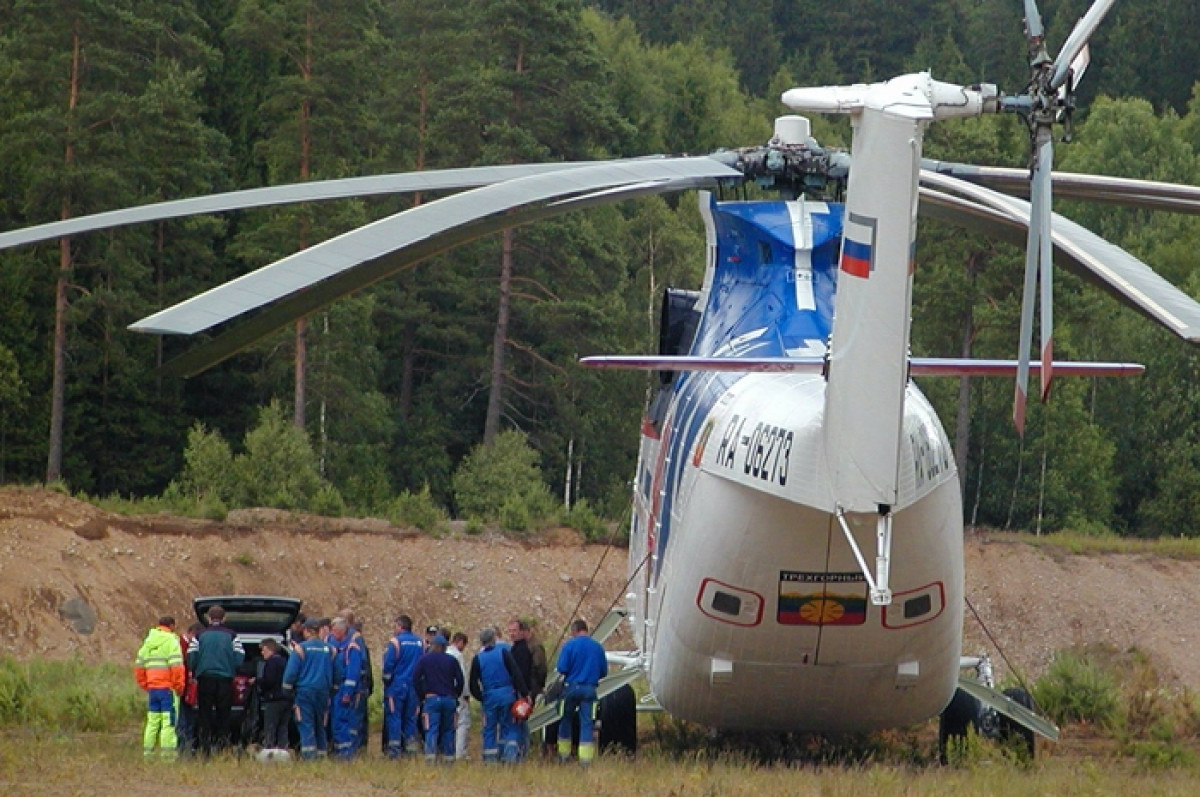 The gigantic Mi-26 is taking a break during a power line construction work in southern Sweden. Some of the ground crew is seen next to the aircraft.