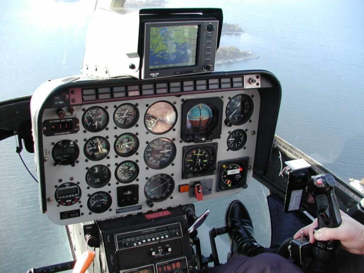 Tomas Wallis of Arlanda Helicopter is piloting one of the company\'s Long Rangers towards the mainland after a journey to the outer archipelago.