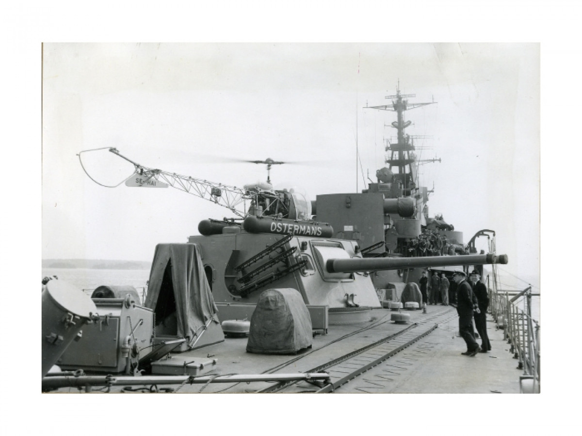Idling at a gun turret onboard the Navy cruiser Tre Kronor. The turret was a routine landing spot on some large ships, in the early years of military helicopter aviation, before heli-decks were available.