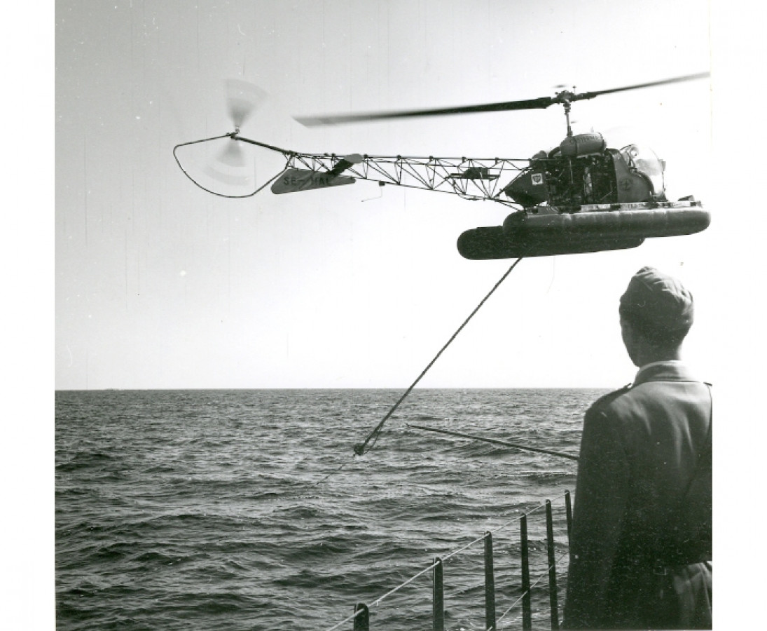 Towing, or transporting a rope, during navy operations in the 60s.\r\n\r\nThe photo belongs to Marinens Pressdetalj, via the Swedish Maritime Museum\'s collection (published with permission). The photographer is unknown.