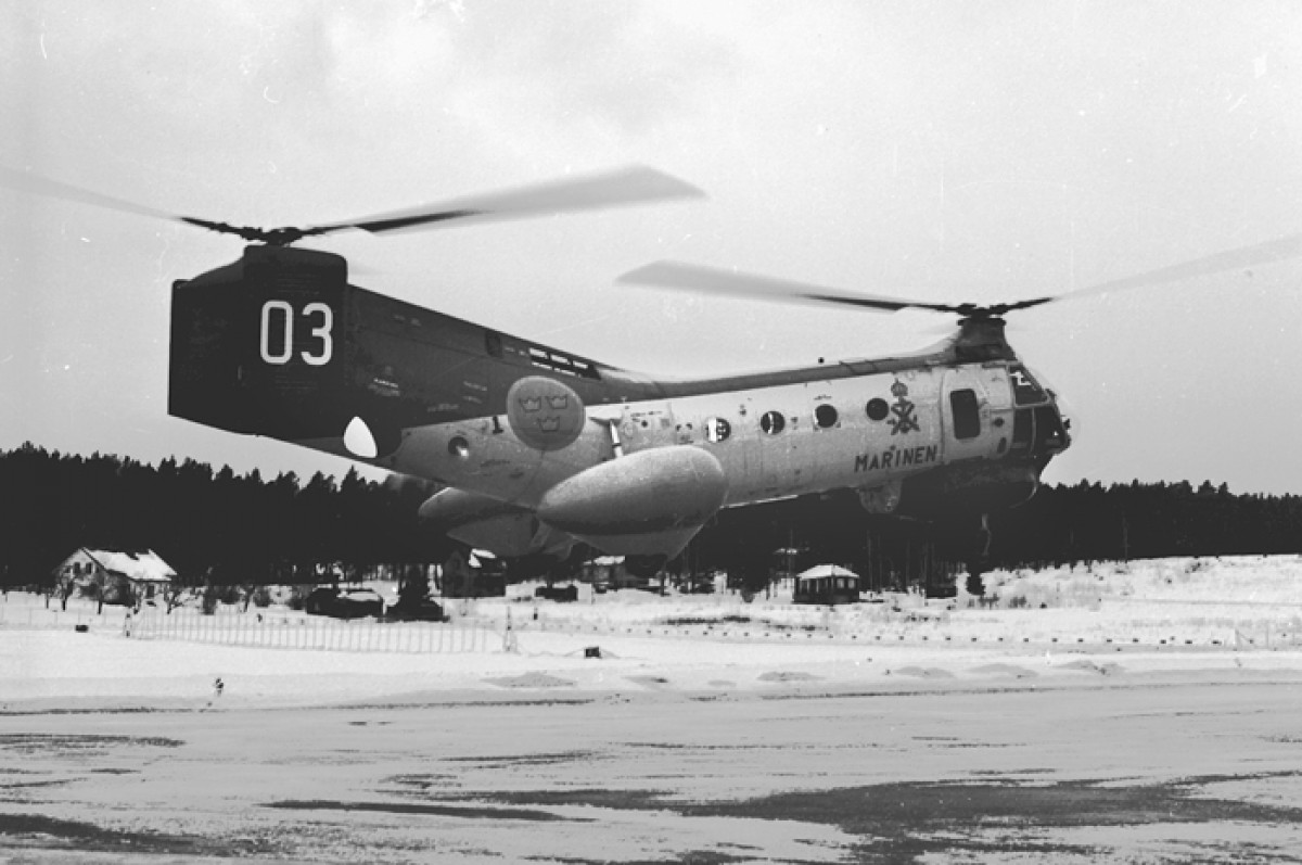 This photo was taken outside Hangar 81 at F18 Tullinge Air Force Base in southern Stockholm in the late-50s. The helicopter was delivered in May 1958 and it was lost in a tragic accident in February 1960. The accident, which occurred Skå-Edeby airfield in Stockholm due to a technical malfunction, was Sweden's first fatal helicopter crash, and it killed all three on board.